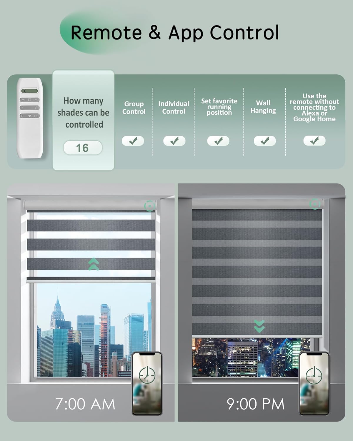 Control up to 16 motorized roller shadesClear button functions, easy to understand