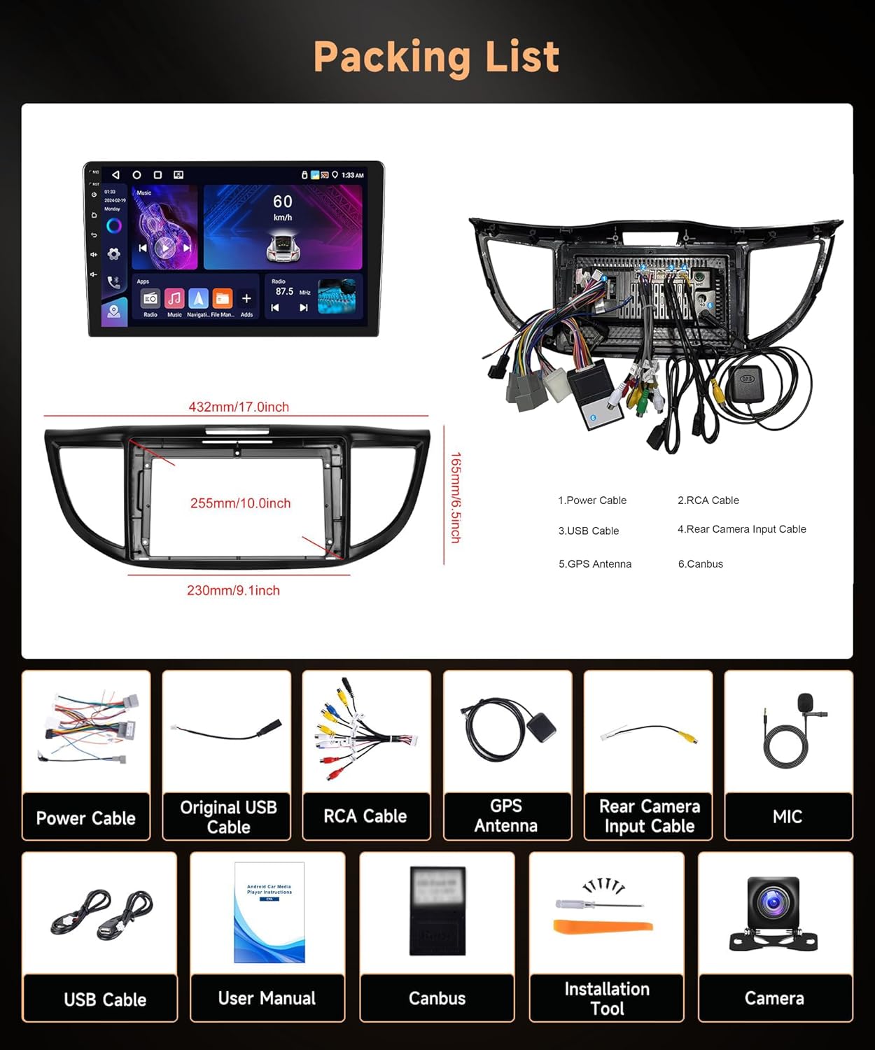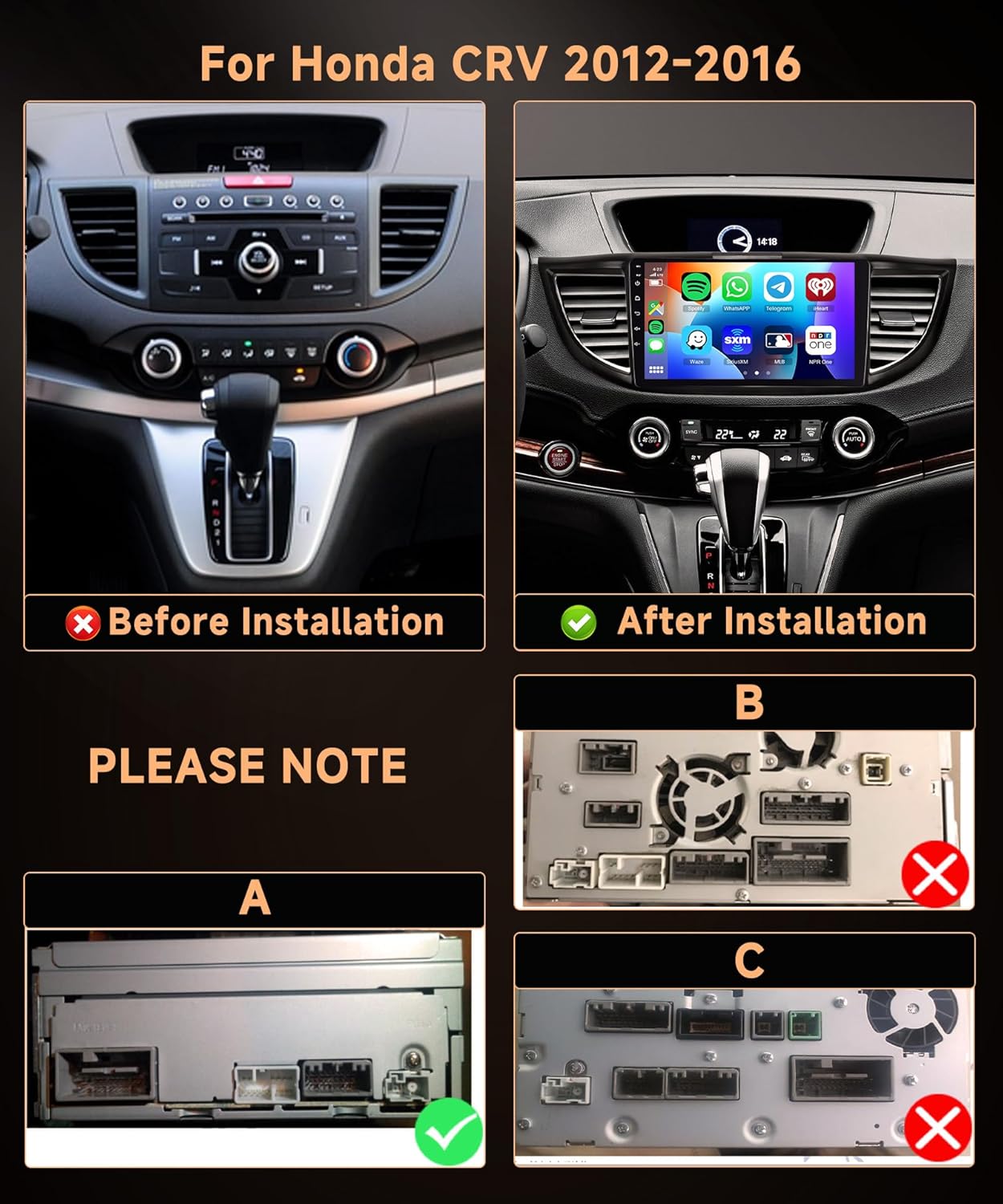 Compatible Vehicles: for Honda CRV 2012-2016. for CRV carplay stereo equipped with Android system, 4Core CPU, Memory:4GB (RAM)+64GB (ROM) with powerful and stable processing and storage, with no lag or delay. 9 inch HD touch screen: Enjoy a large and clear display with 1280*720 resolutiona nd responsive touch control, which allows you to operate the device easily and comfortably.