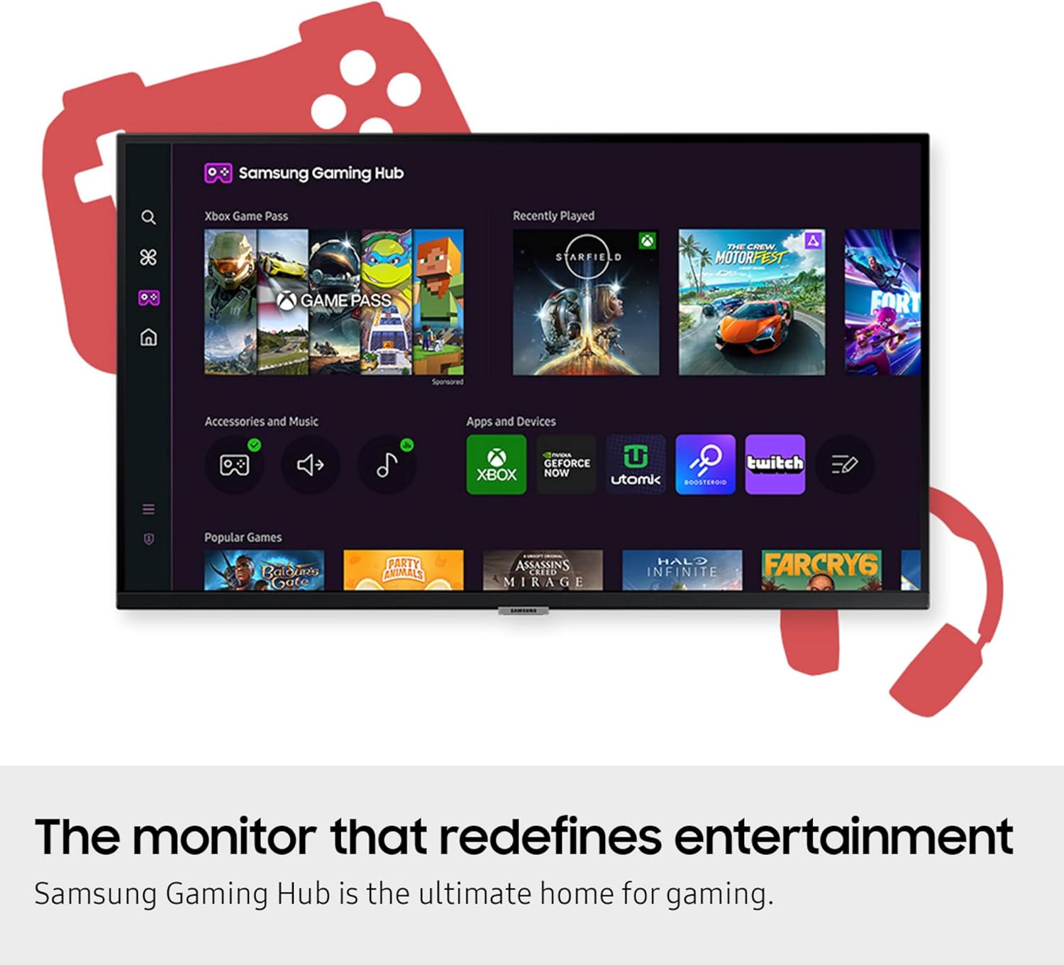 ¹Features, services and app availability may vary by country and region. Samsung TV Plus and Universal Guide may not be available in some regions. Some features may require separate subscriptions. The user interface is subject to change without notice. Smart Monitor does not include a TV tuner, which is not necessary for streaming apps. Internet connection is required. Remote control specifications vary by country and region. Keyboard and mouse control compatibility varies by app. Access to the full range of smart features, such as network-based services, applications (including games and streaming services), and smart home functionality requires a Samsung account. Without logging in, functionality is limited to external devices, e.g. via HDMI. ²Each device must be registered with a single Samsung account and connected to the same Wi-Fi network. MultiControl requires updated Galaxy phones and tablets with One UI 5.1 or above and Galaxy Book series devices released in 2021 or later with Samsung Settings v1.5(Inter) or Samsung Settings v3.3(ARM). Some models may have limited feature support. Screen images simulated for illustrative purposes. ³4K availability in over-the-top content may vary, depending on content service subscription type and internet connection. ⁴Gaming Hub is available in limited countries, with app availability differing by country.