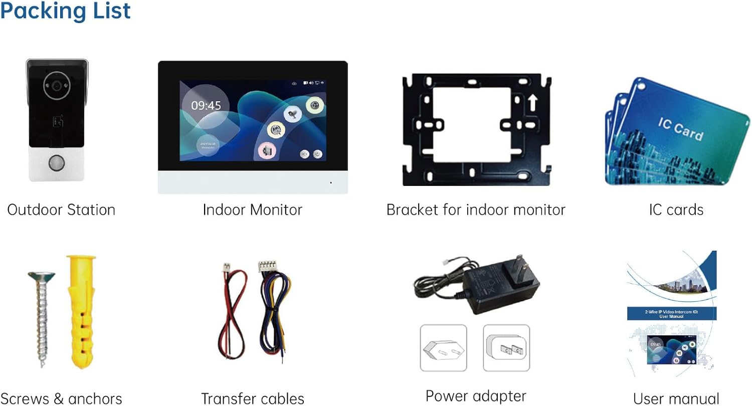 Outdoor Station x 1Indoor Monitor x 1IC Cards x 5Power Adaptor x 1Installation Accessories x 132GB TF Card x 1English User Manual x 1