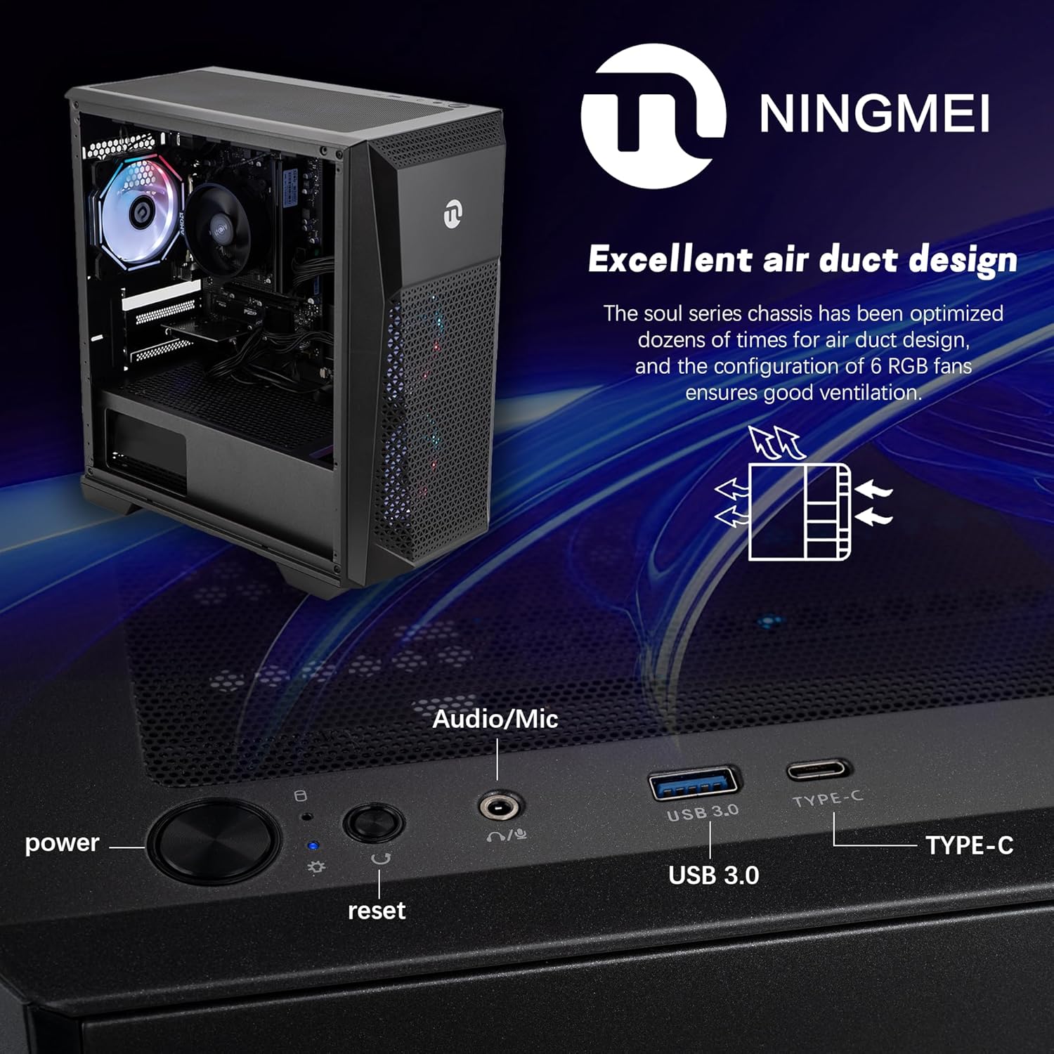 【Extreme heat dissipation and aesthetics】6 RGB Fans for Maximum Air Flow. NINGMEI Soul Series Case, the top of the chassis is equipped with an independent and removable magnetic dust screen to maximize heat dissipation and aesthetics.