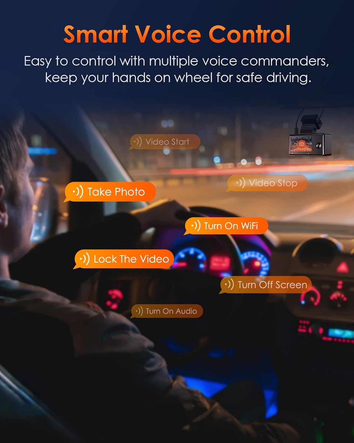 【Hands-Free Voice Control&Wireless Controller】 Comes with multiple basic voice commands(only available in English, Japanese, Russian and Chinese), and you can simply give voice commands to save video, take photos, start the video, and turn on/off audio/ WiFi/screen while driving. The wireless Controller lets you easily capture beautiful scenery during the trip and quickly lock emergency videos, which makes the need hands-free and improves the convenience of using the cam, making driving safe.