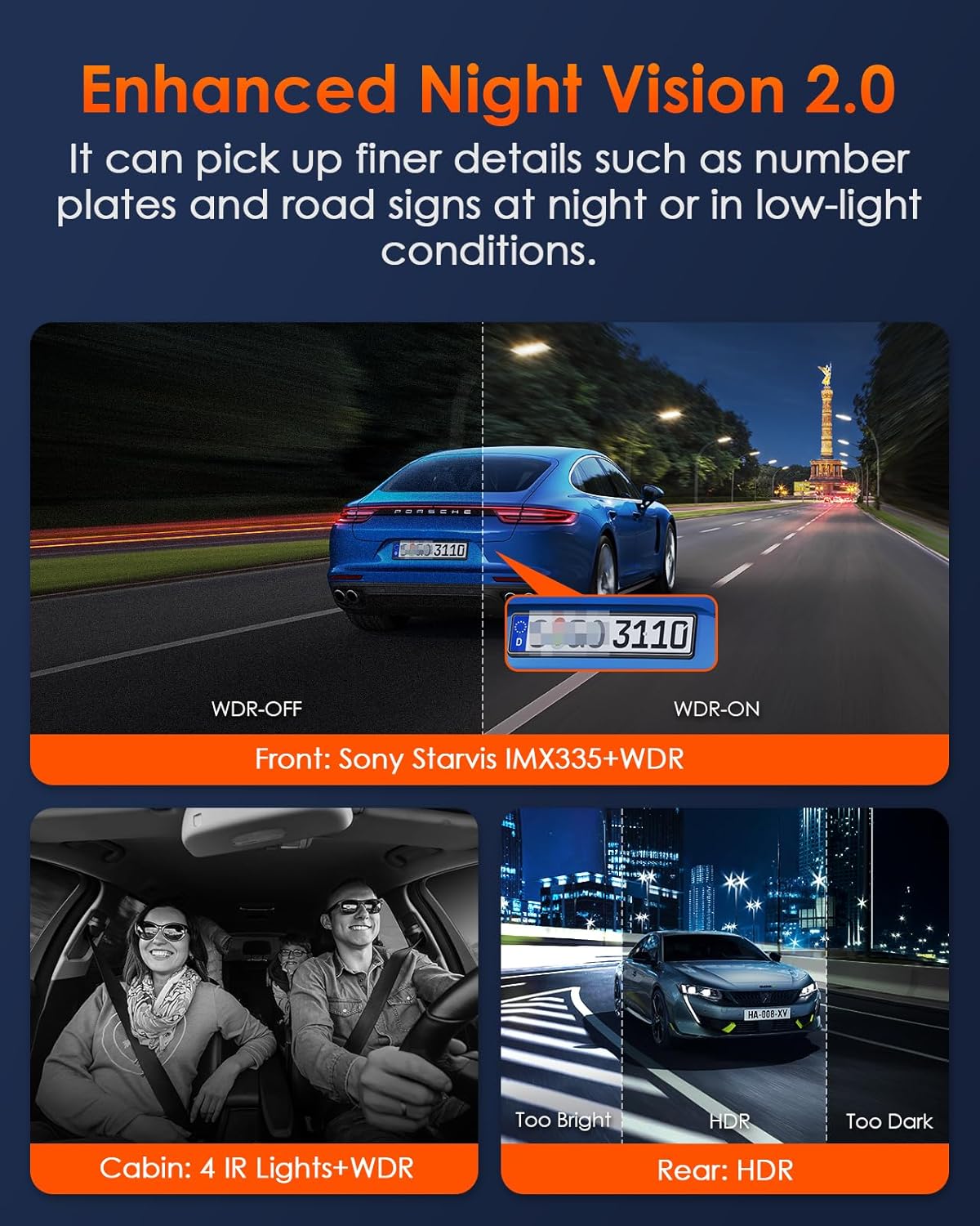 【STARVIS Infrared Night Vision】The 2-channel dash cam interior facing camera with 4 infrared LED lights, can accurately capture the driver and passengers in low light. Equipped with WDR and HDR technology and upgraded STARVIS image sensors in the front camera, the dash camera will automatically balance the light and dark areas and capture clear videos and image footage even in poor lighting conditions at night. Extremely suitable for Taxis, Uber, Lyft, rideshare, and families.