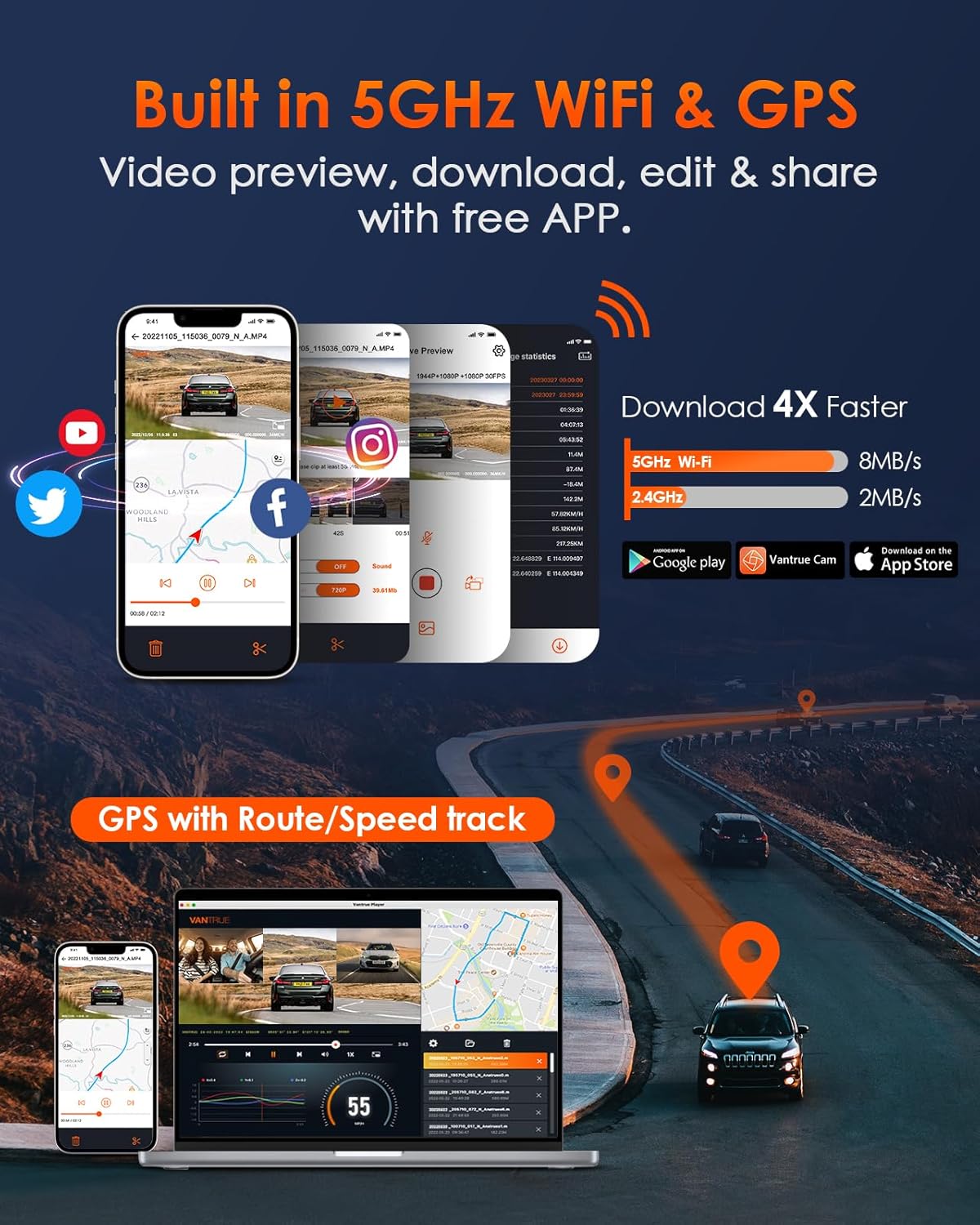 【Inbuilt WiFi & GPS Speed】The inbuilt 5GHz Wi-Fi brings faster transfer speed, and allows you directly to live view, configure, file browse, download, and share the happening on the road to social media easily on your phone via Vantrue Free APP(No need subscription)! The included GPS module accurately records your driving route information in real time, and the GPS player with a zoom-in function offers high-resolution images that effectively capture license plate details for solid evidence.