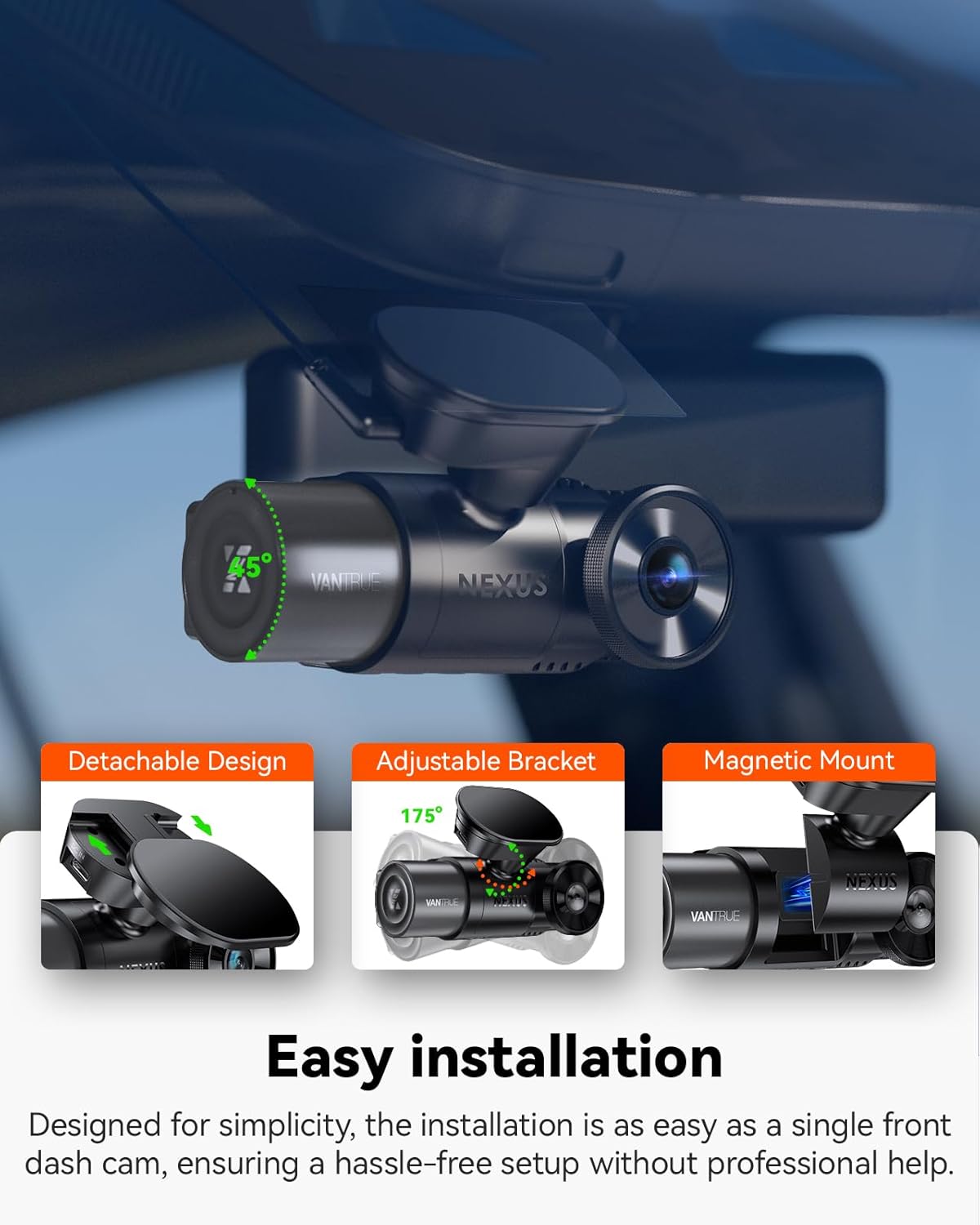 [Easy Installation and Quick Dismounting] The front and cabin dash cam offers a hassle-free setup without professional assistance. Its adjustable magnetic mount features a compact ball joint for easy positioning and a removable pad for flexibility. It supports up to 512GB of external memory (SD card sold separately; recommended Vantrue SD card, ASIN: B09SNRFSS3), ensuring ample storage for any journey.