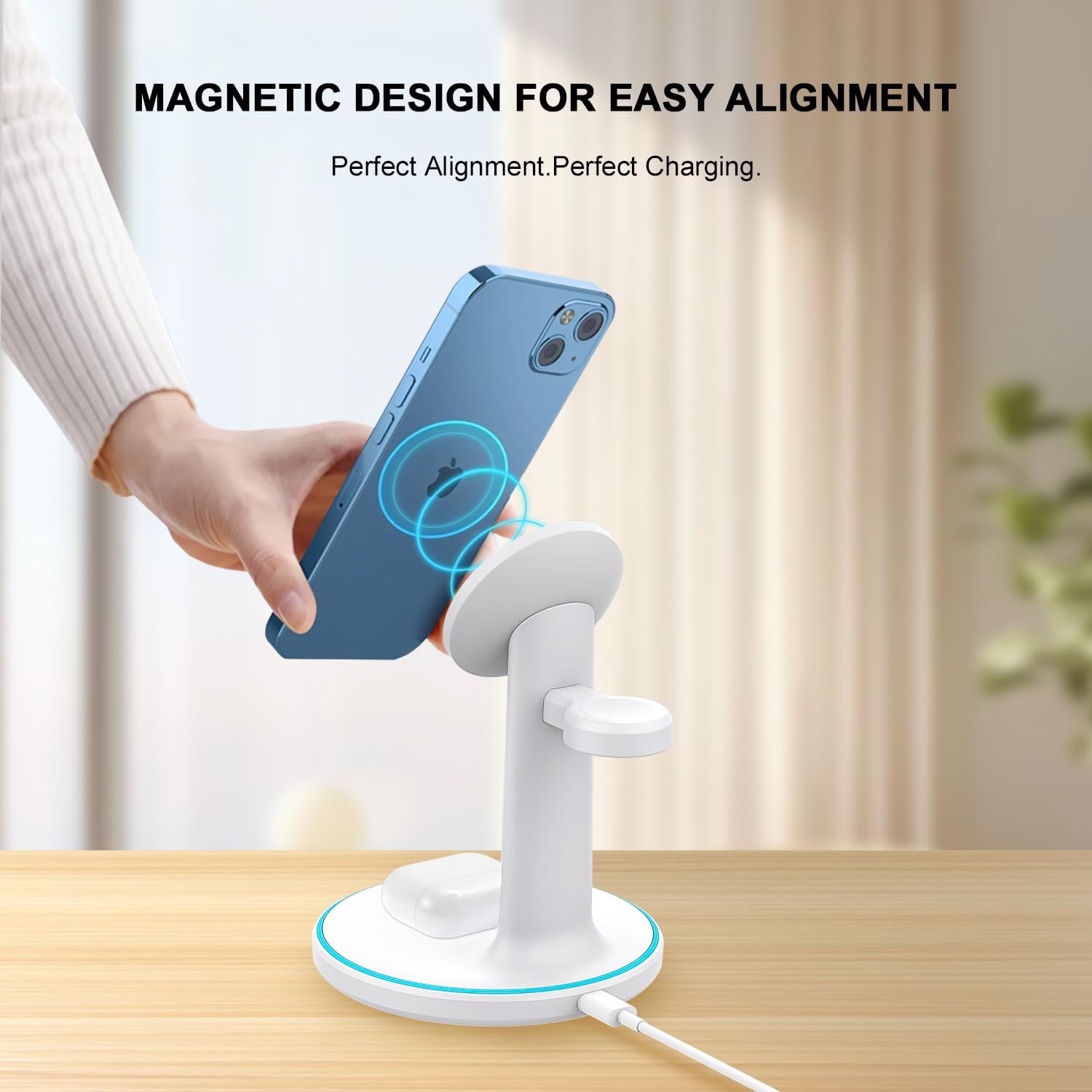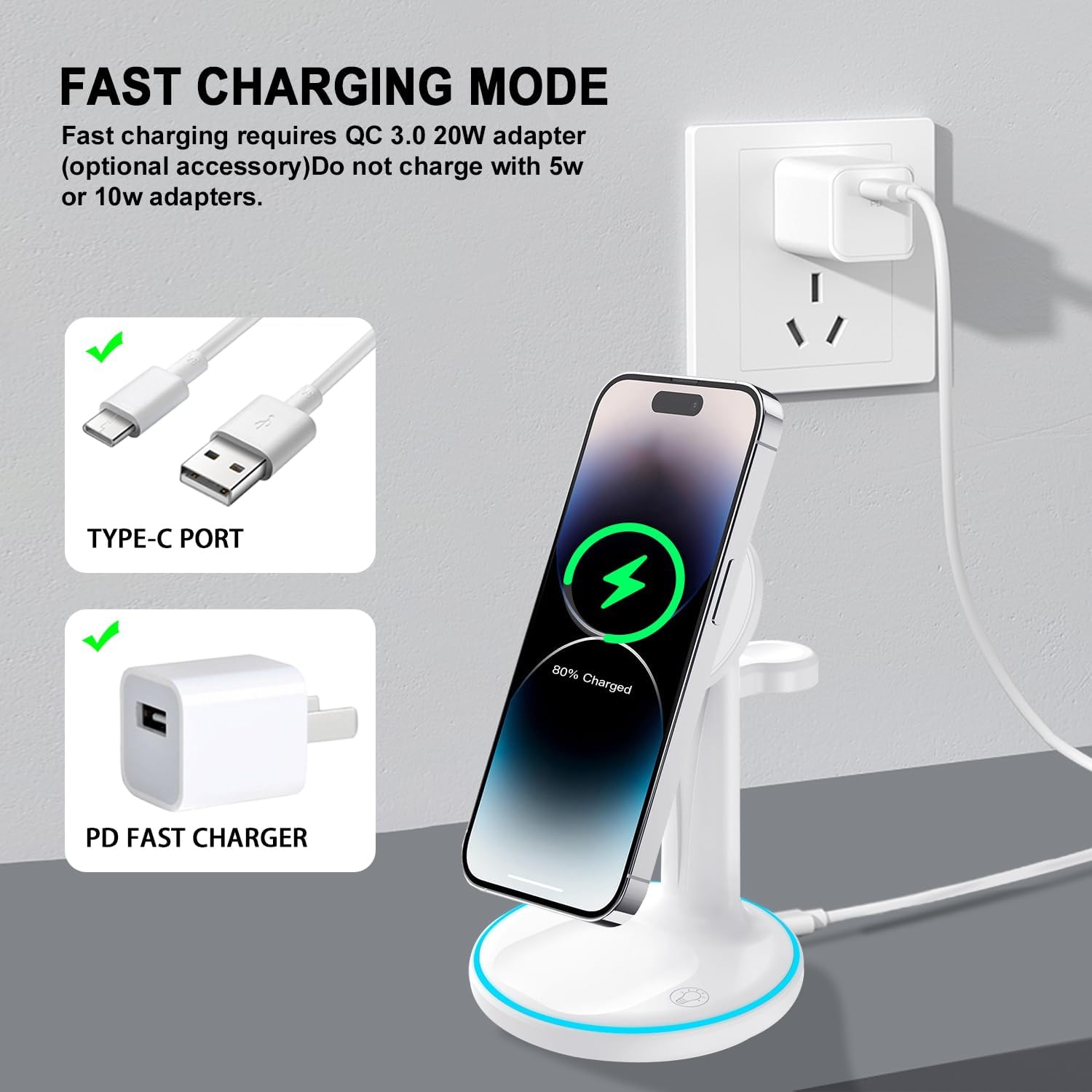 🔋【All-in-one Charging Solution】The 3 in 1 fast wireless phone charging stand/wireless phone charger for iphone is specially designed with blue light around on/off. The phone charging stand charges your Phone, iWatch and earphones at the same time, allowing simultaneous charging with an optimal voltage and current value. Say goodbye to cluttered/messy charging cables and enjoy a neat and tidy desktop environment, just one USB C-A cable with 15W QC3.0+PD adapter (Both included) and the wireless charging station for multiple devices. Just enjoy the truely all-in-one.