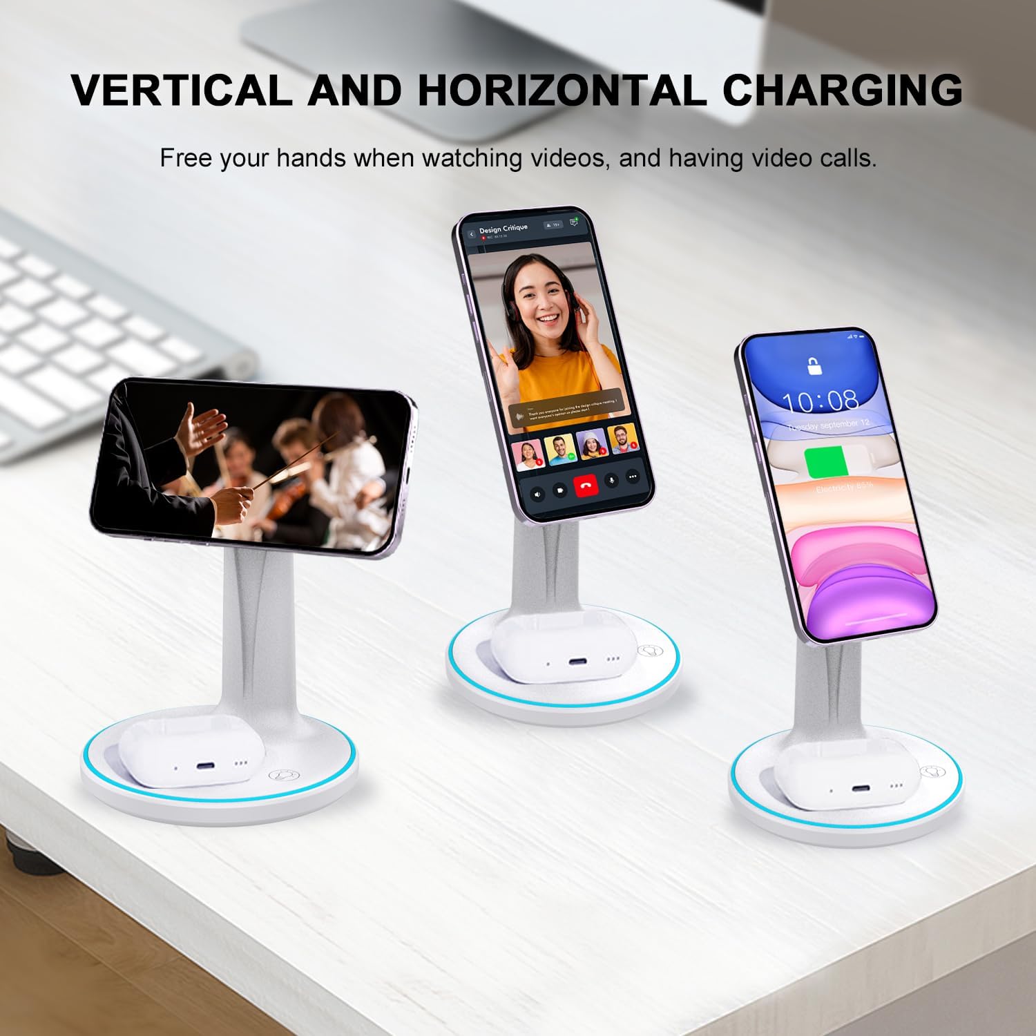 🔋【Universal Compatibility】The 3 in 1 wireless phone charging stand is compatible with various models of Phone, iWatch, and AirPods, including the latest devices. Simply place your devices in the corresponding positions, and the charging will start automatically, providing you with convenience and speed.