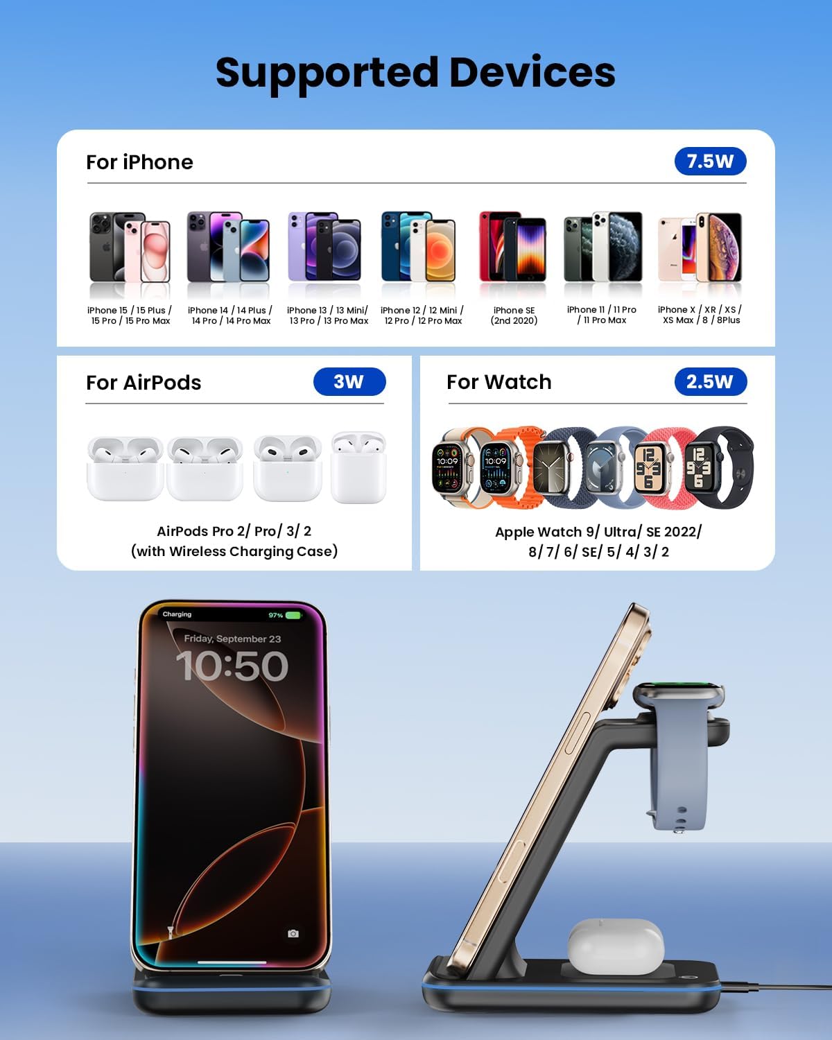 Universal Compatibility: 10W Max Fast Charging for Samsung Galaxy S22+/S22/21/ S20/S10/S10 Plus, etc. 7.5W Max Fast Charging for iPhone 16/15/14/14 Plus/14 Pro/14 Pro Max/13 Pro Max/13Pro/13/12 Pro Max/12 Pro/12/11/ 11 pro/11 Pro Max/XS XS Max/XR/X/8/8 Plus.【Not for iPhone 12 Mini/13 Mini】5W Max Standard Charging for Apple Airpods 3/2/Pro. 3W Max Standard Charging for Apple Watch 8/SE 2/7/6/SE/5/4/3/2. (Please upgrade your watch to WatchOS 8.6)