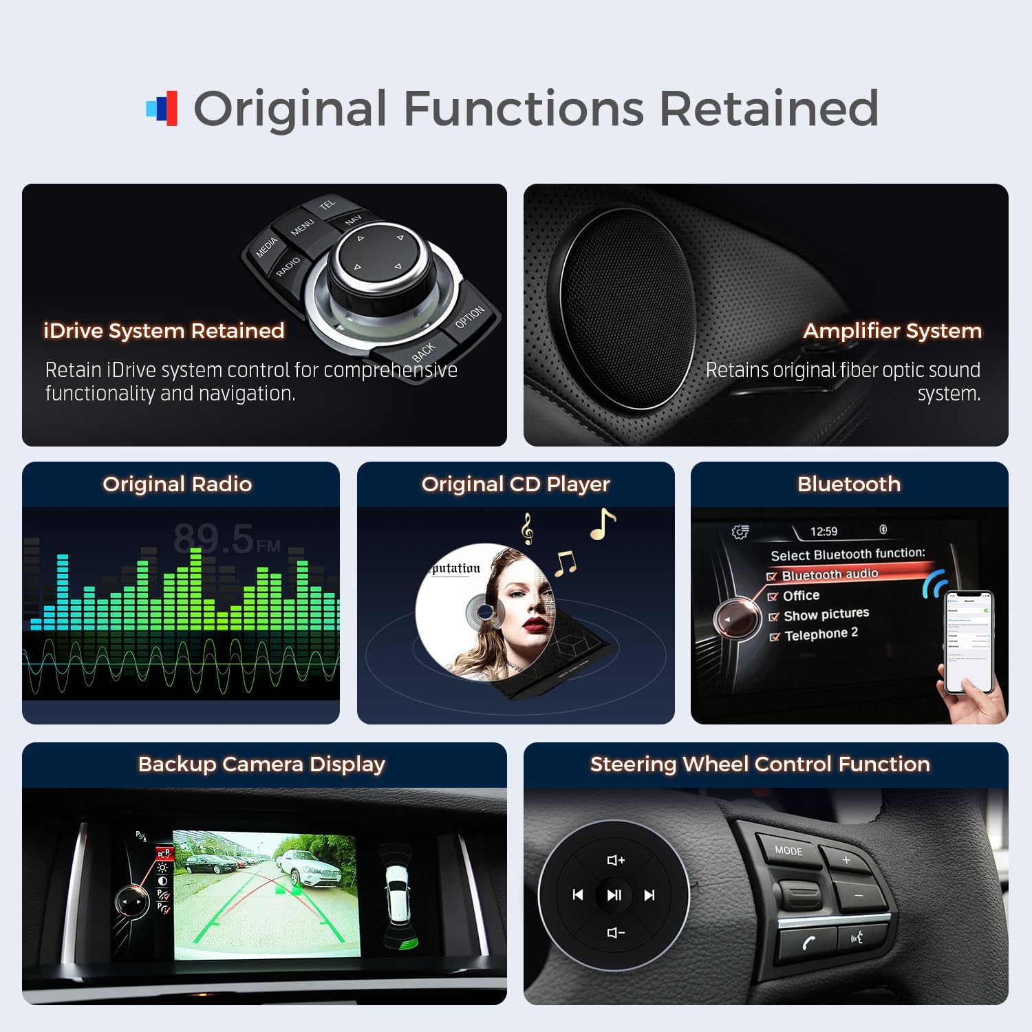 KEEP CAR Original: The car radio seamlessly integrates OEM car-centric functions like speed, fuel level, and safety warnings into your chosen dashboard display, retains original fiber optic sound system, original radio, original CD player, bluetooth