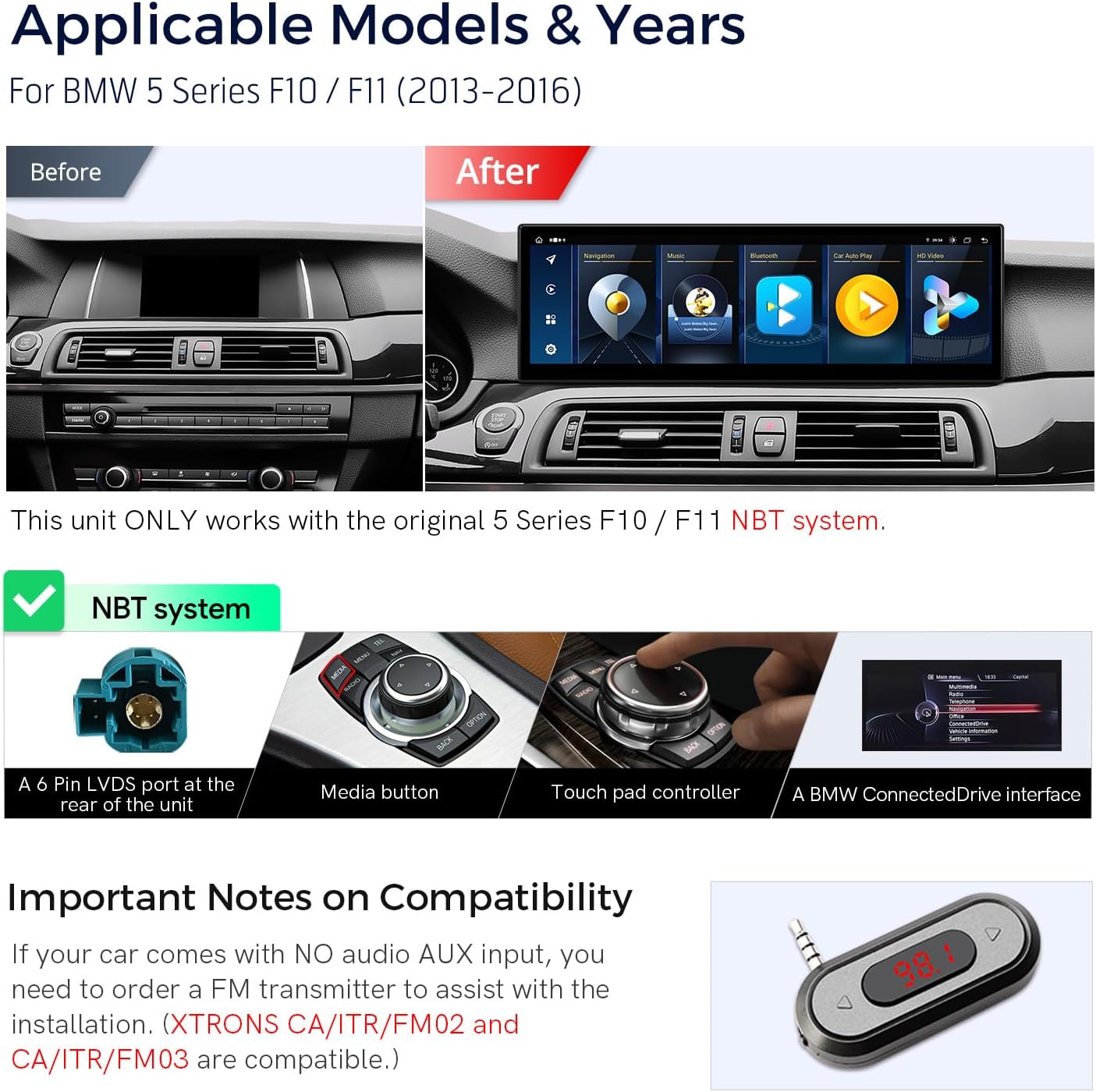 XTRONS 14.9 Inch Android 14 Car Stereo for BMW F10/F11 (2013-2016) NBT System, 2K IPS Touch Screen 4+64GB Global 4G Car Radio GPS Navigation Support Wireless CarPlay Android Auto